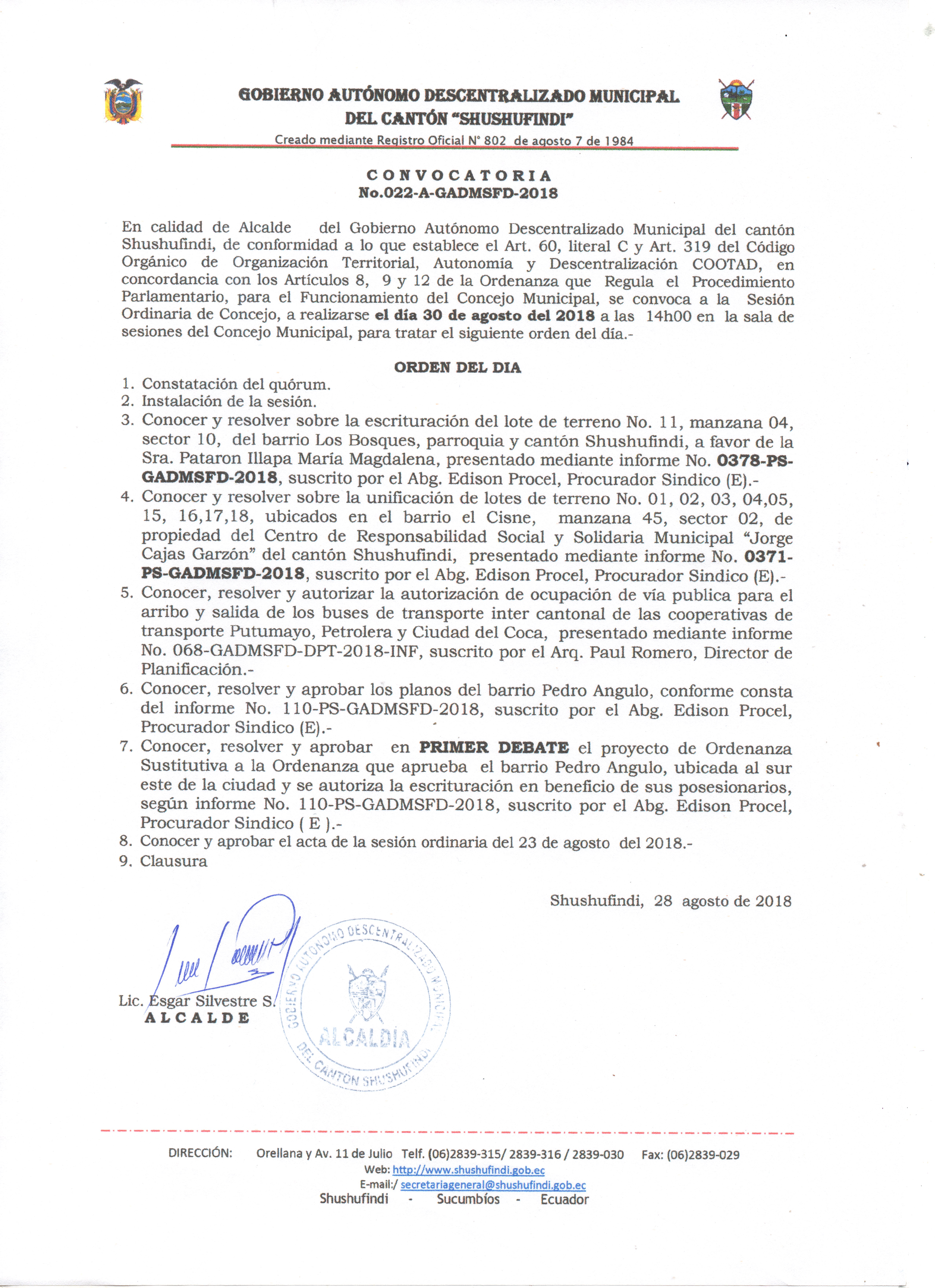 NOTICIAS SESIÓN ORDINARIA DEL CONCEJO MUNICIPAL agosto 28, 2018 Posted by DANNY ALCIVAR MONAR 28 Ago Jueves 30 de agosto de 2018. 14:00 Sala de sesiones del GAD MUNICIPAL Lic. Esgar Silvestre ALCALDE DESCARGAR INVITACIÓN