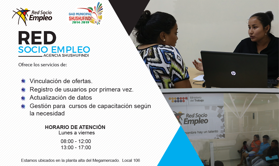 Mediante la suscripción del CONVENIO de cooperación interinstitucional entre el Gobierno Municipal de Shushufindi y el Ministerio de Trabajo; la RED SOCIO EMPLEO, ofrece en la ciudad de Shushufindi los servicios de:
