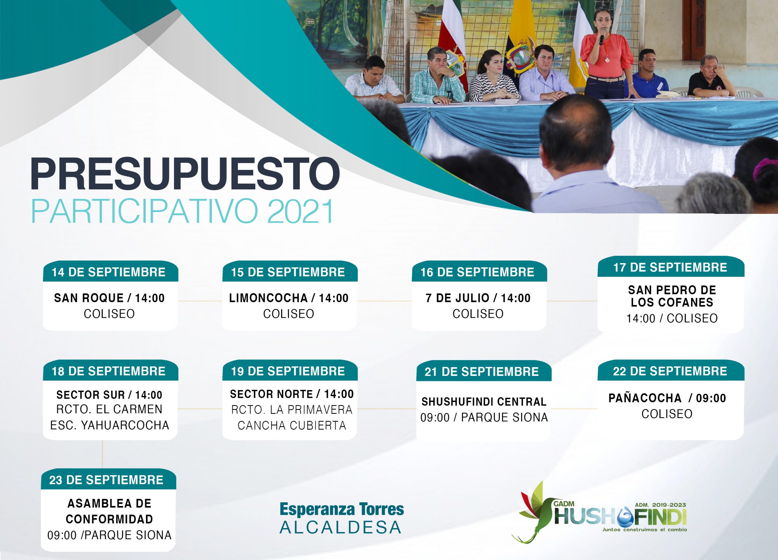 El Gobierno Municipal de Shushufindi en cumplimiento a lo que establecen los artículos 69, 70 y 71 de la Ley Orgánica de Participación Ciudadana INVITA a participar de las diferentes asambleas locales para la planificación y formulación del Presupuesto Participativo a ejecutarse en el año fiscal 2021.