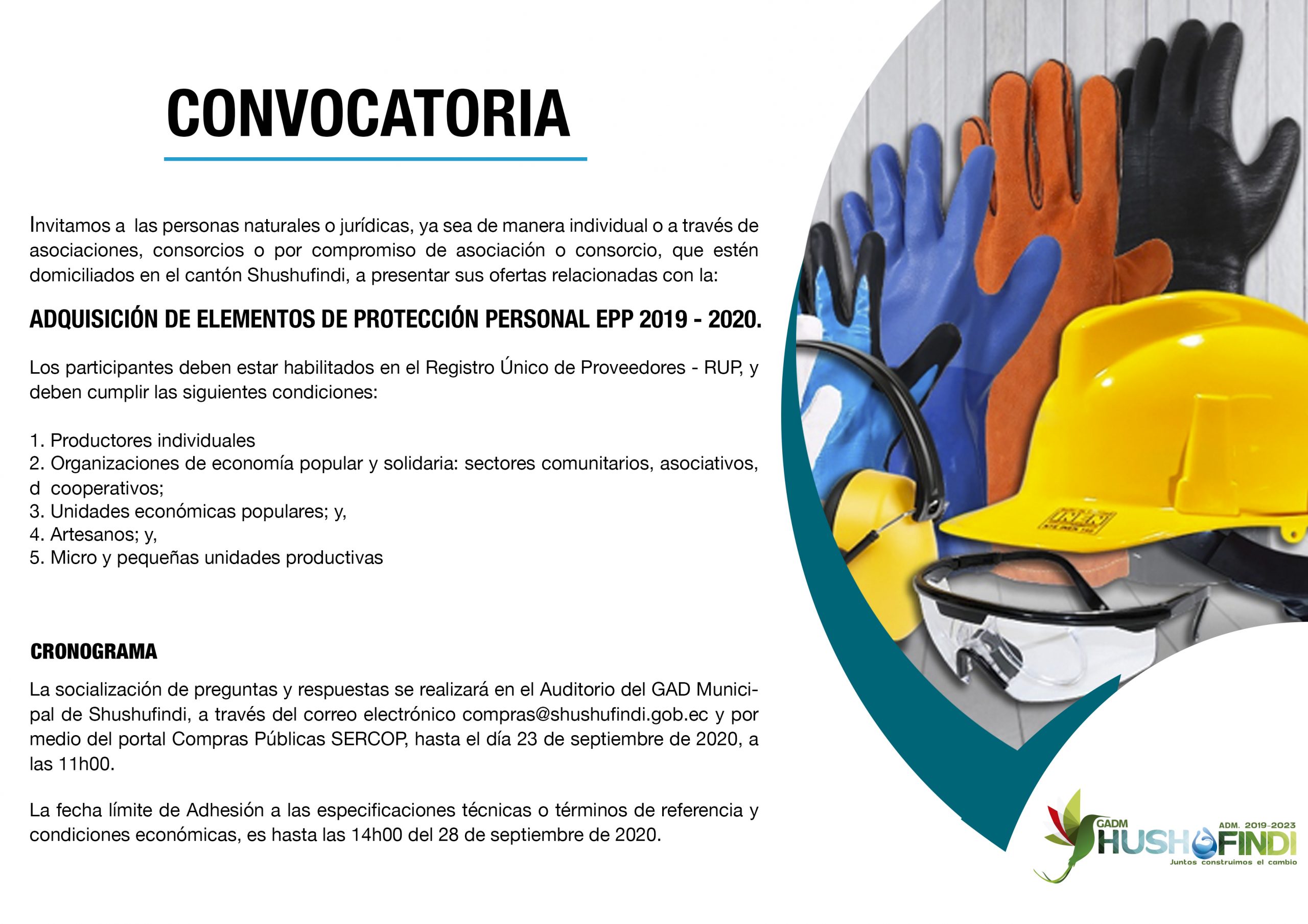 La socialización de preguntas y respuestas se realizará en el Auditorio del GAD Municipal de Shushufindi, a través del correo electrónico compras@shushufindi.gob.ec y por medio del portal Compras Públicas SERCOP, hasta el día 23 de septiembre de 2020, a las 11h00.