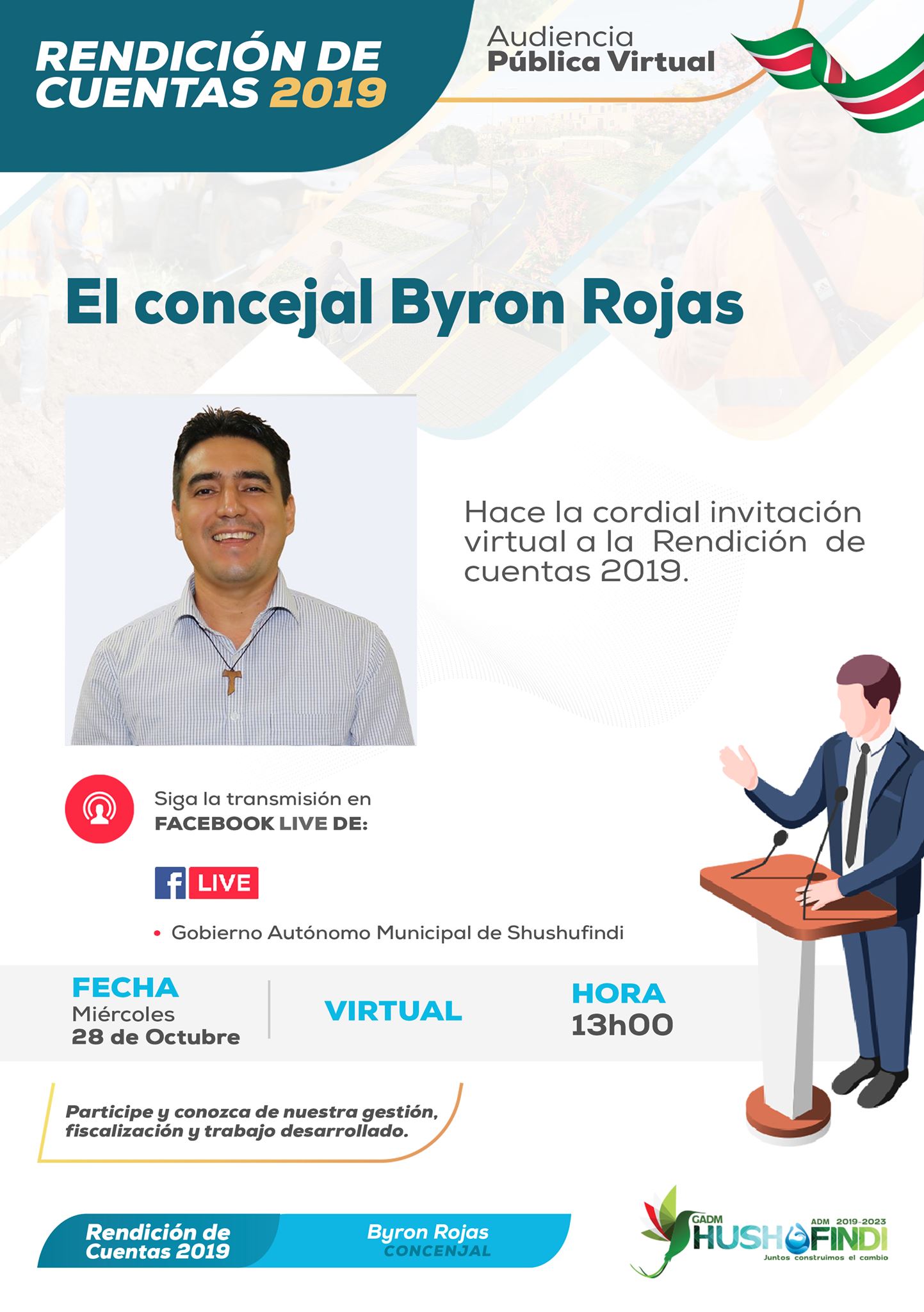 El vicealcalde, ingeniero Byron Rojas invita a conocer el Informe de Rendición de Cuentas, Mayo – Diciembre de 2019. Siga la transmisión en Facebook live de Gobierno Autónomo Descentralizado Municipal de Shushufindi, y sea parte del proceso que permite transparentar las acciones de nuestros representantes en el Concejo Municipal.