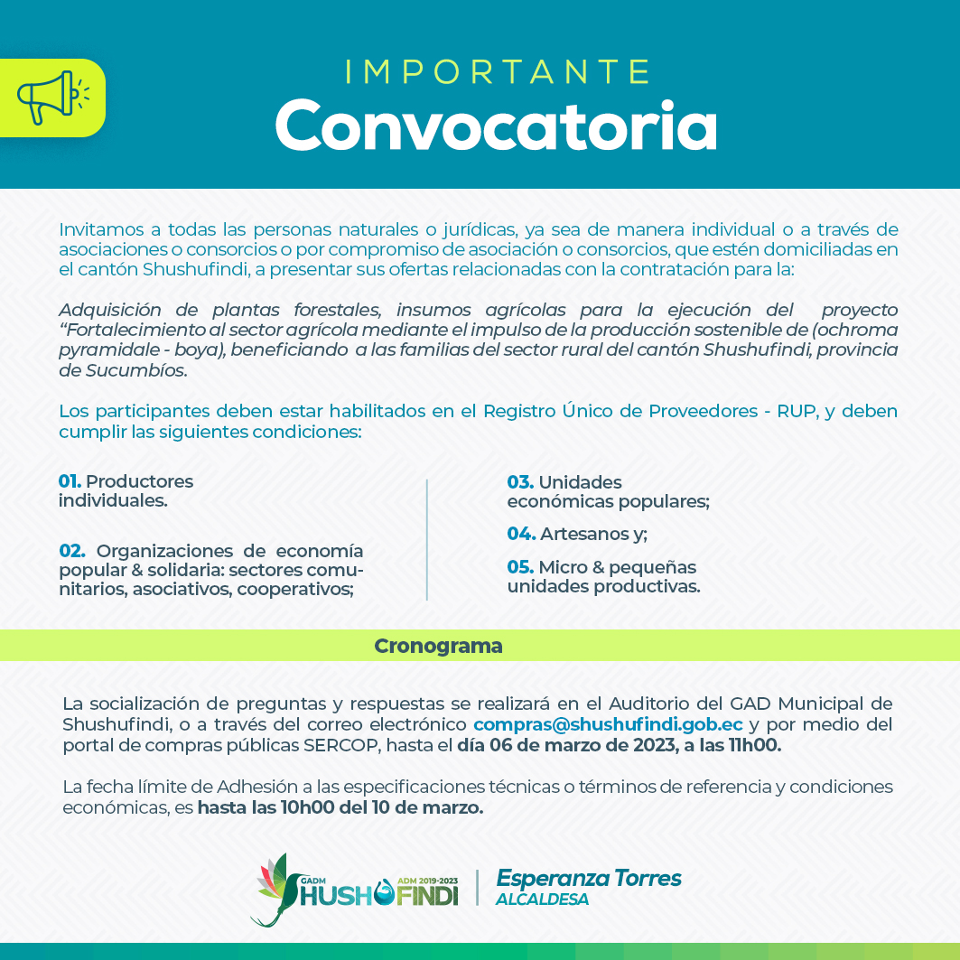 Invitamos a todas las personas naturales o jurídicas, ya sea de manera individual o a través de asociaciones o consorcios o por compromiso de asociación o consorcios, que estén domiciliadas en el cantón Shushufindi, a presentar sus ofertas relacionadas con la contratación para la: