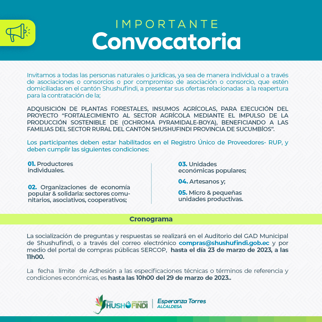 REAPERTURA – ADQUISICIÓN DE PLANTAS FORESTALES, INSUMOS AGRÍCOLAS, PARA EJECUCIÓN DEL PROYECTO “FORTALECIMIENTO AL SECTOR AGRÍCOLA MEDIANTE EL IMPULSO DE LA PRODUCCIÓN SOSTENIBLE DE (OCHROMA PYRAMIDALE-BOYA), BENEFICIANDO A LAS FAMILIAS DEL SECTOR RURAL DEL CANTÓN SHUSHUFINDI PROVINCIA DE SUCUMBÍOS”.
