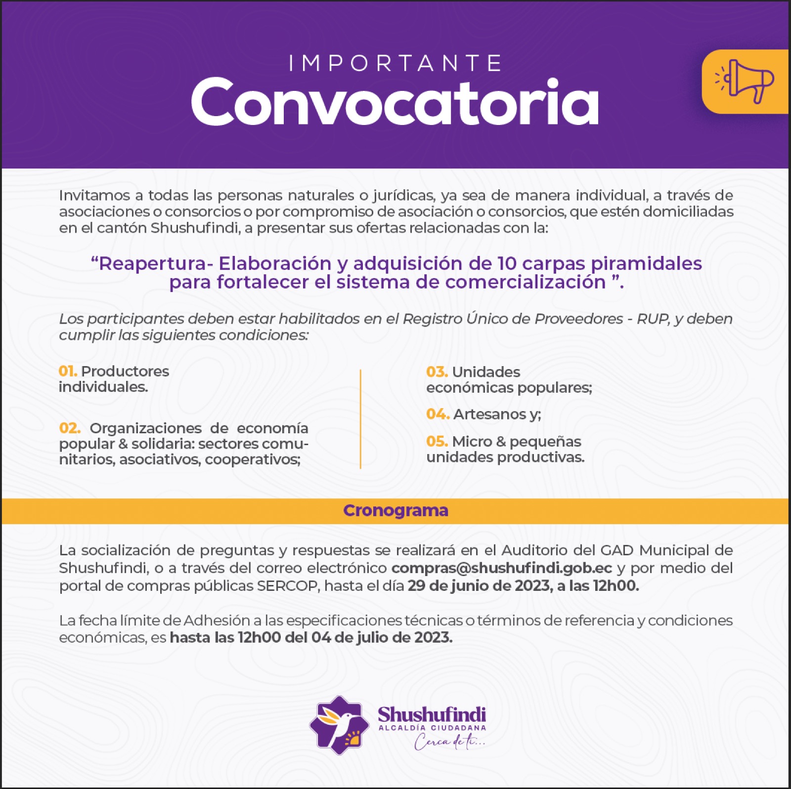 La Alcaldía de Shushufindi invita a los proveedores interesados a presentar sus ofertas relacionadas con la contratación para la 𝗘𝗹𝗮𝗯𝗼𝗿𝗮𝗰𝗶𝗼́𝗻 𝘆 𝗮𝗱𝗾𝘂𝗶𝘀𝗶𝗰𝗶𝗼́𝗻 𝗱𝗲 𝟭𝟬 𝗰𝗮𝗿𝗽𝗮𝘀 𝗽𝗶𝗿𝗮𝗺𝗶𝗱𝗮𝗹𝗲𝘀 𝗽𝗮𝗿𝗮 𝗳𝗼𝗿𝘁𝗮𝗹𝗲𝗰𝗲𝗿 𝗲𝗹 𝘀𝗶𝘀𝘁𝗲𝗺𝗮 𝗱𝗲 𝗰𝗼𝗺𝗲𝗿𝗰𝗶𝗮𝗹𝗶𝘇𝗮𝗰𝗶𝗼́𝗻.
