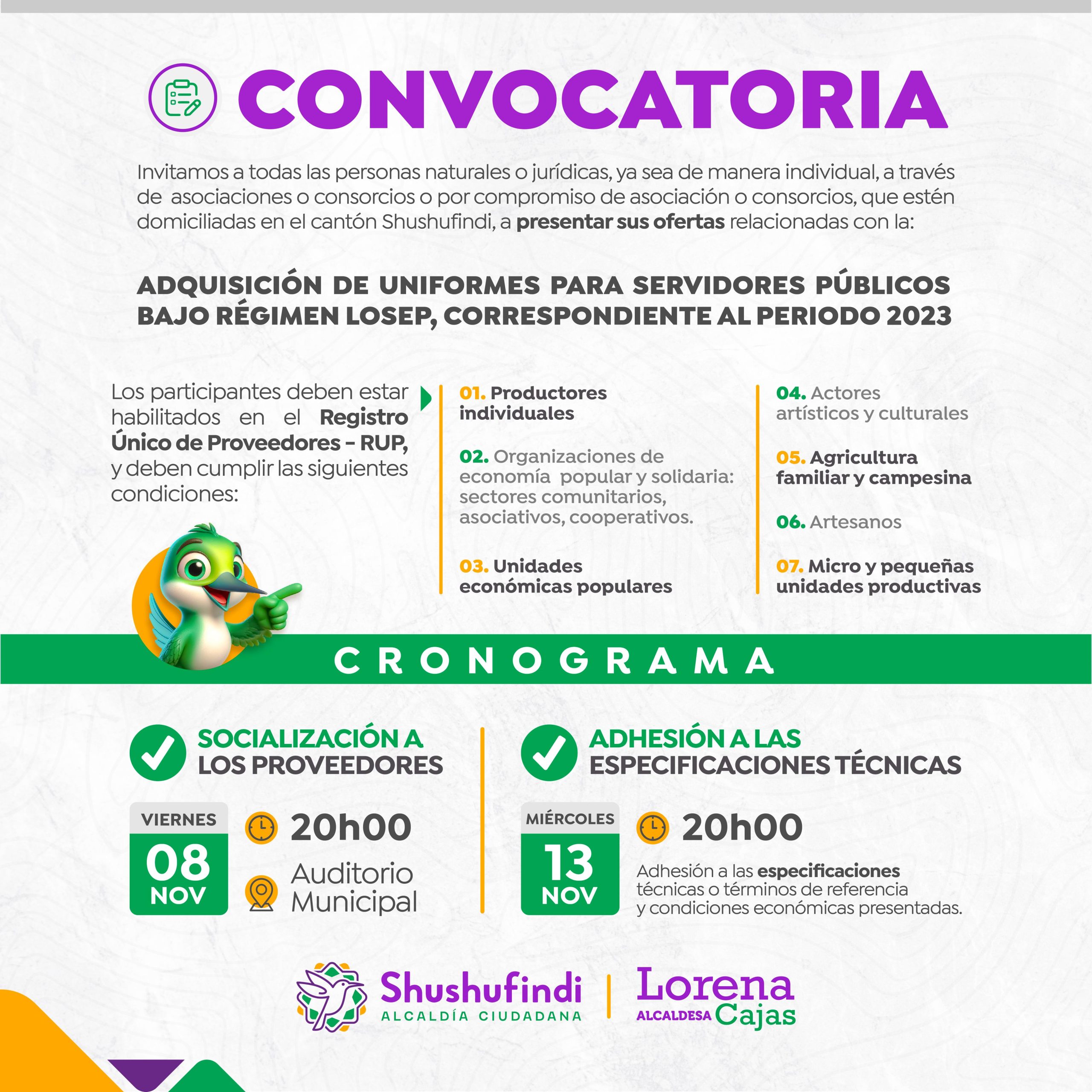 El Gobierno Autónomo Descentralizado Municipal del Cantón Shushufindi CONVOCA a través del Portal Institucional de Servicio Nacional de Contratación Pública y redes sociales de la institución, a todas las personas naturales o jurídicas, ya sea de manera individual o a través de asociaciones o consorcios o por compromiso de asociación o consorcios, que estén domiciliados en el Cantón Shushufindi, para la presentación de ofertas relacionadas con la ADQUISICIÓN DE UNIFORMES PARA SERVIDORES PÚBLICOS BAJO RÉGIMEN LOSEP, CORRESPONDIENTE AL PERIODO 2023, que estén habilitadas en el Registro Único de Proveedores- RUP, siempre y cuando cumplan una de las siguientes condiciones: