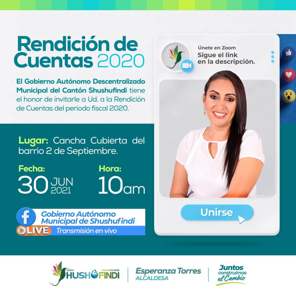 25 Jun INVITACIÓN A RENDICIÓN DE CUENTAS 2020 La ingeniera Esperanza Torres, en calidad de alcaldesa del cantón Shushufindi INVITA a la deliberac... Continue reading