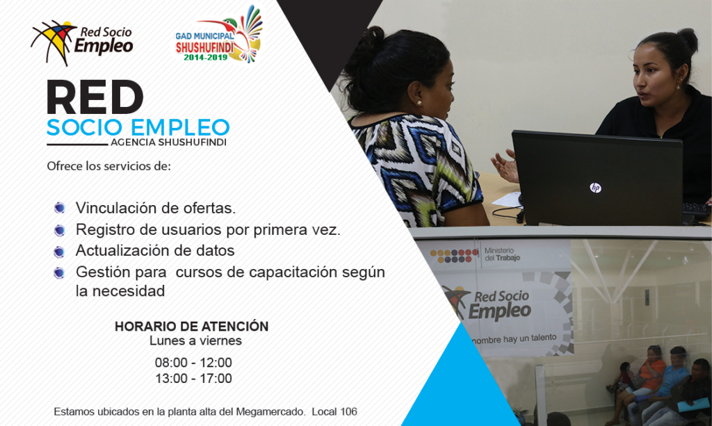 24 Abr SERVICIOS DE LA RED SOCIO EMPLEO – AGENCIA SHUSHUFINDI Mediante la suscripción del CONVENIO de cooperación interinstitucional entre el Gobierno Municipal de Shushufindi y el Ministerio de Tr... Continue reading
