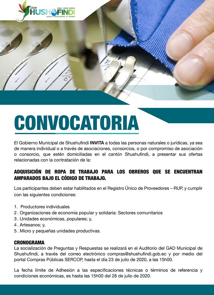 21 Jul CONVOCATORIAS CONVOCATORIA octubre 30, 2023 By Maria Elizabeth Chamba Loaiza Invitamos a todas las personas naturales o jurídicas, ya sea de manera individual o a través de asociaciones o consorcios o p... Continue reading
