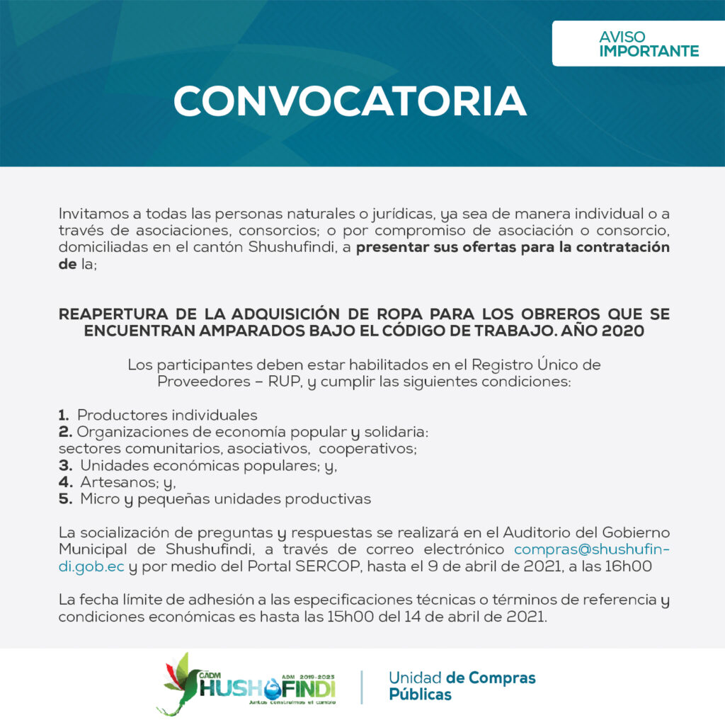07 Abr CONVOCATORIAS CONVOCATORIA octubre 30, 2023 By Maria Elizabeth Chamba Loaiza Invitamos a todas las personas naturales o jurídicas, ya sea de manera individual o a través de asociaciones, consorcios; o por comprom... Continue reading